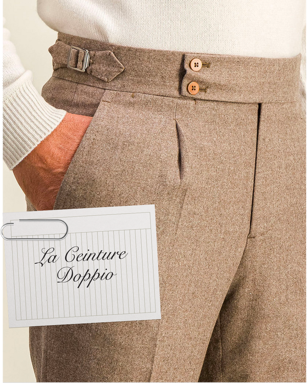 Nous avons baptisé de modèle Doppio en référence aux deux boutons distinctifs à la ceinture du pantalon. Vous êtes nombreux à nous dire que le costume s'efface dans vos milieux professionnels. Les pantalons de ville sont la réponse à cette demande : ils permettent une mise formelle sans pour autant porter un costume. Évidemment vous povuez accompagner ces pantalons d'une veste sport.